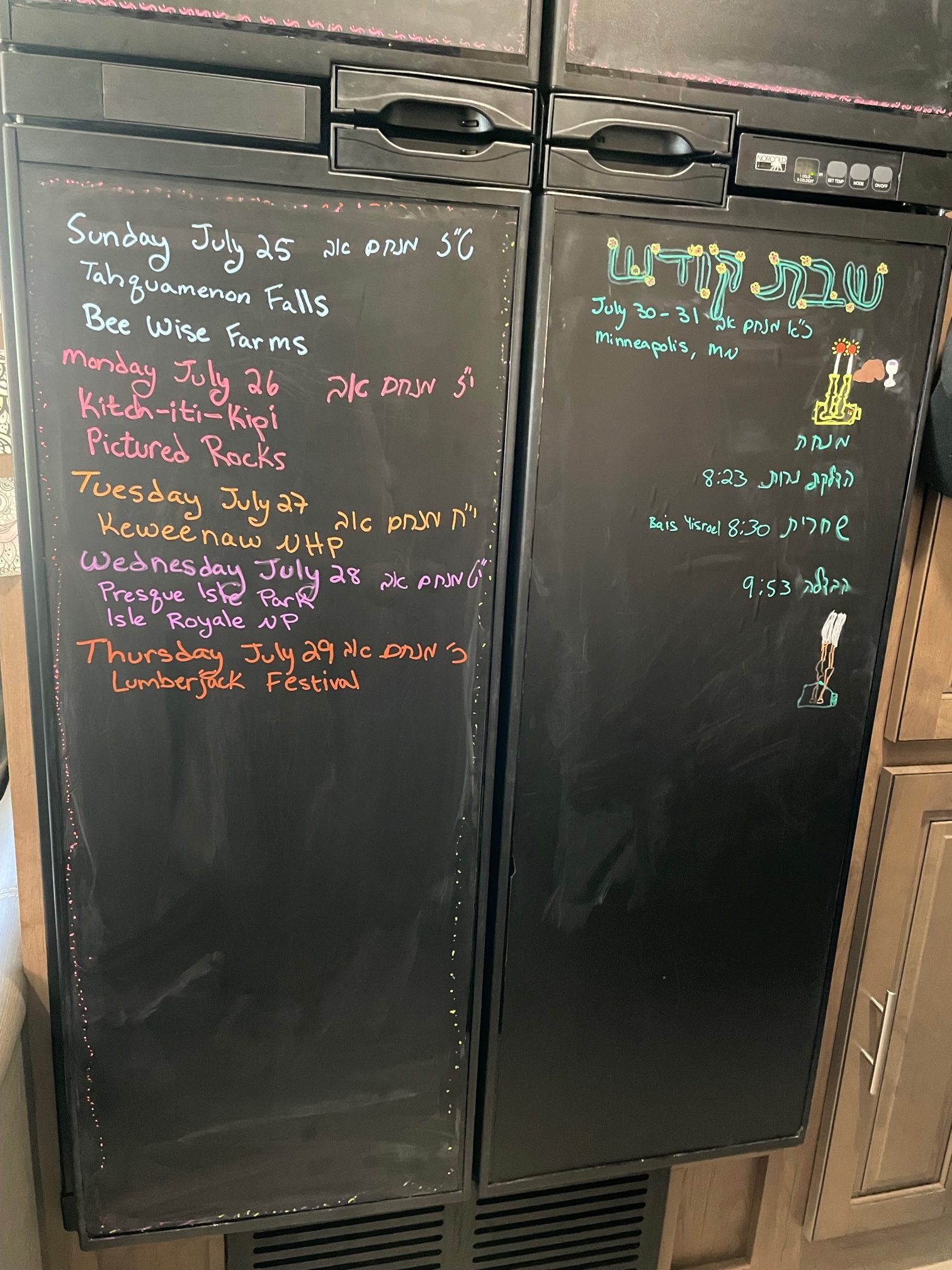 But, the method I use is fairly simple. I attached magnetic chalkboard contact paper to our RV refrigerator and freezer. As you can see in the pictures, our fridge happens to be double the standard. But, you can also see that our schedule really only occupies one door.